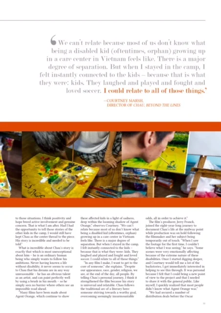 It was a great thrill to have the chance to meet and photograph the inspirational Vietnamese artist Le Minh Chau recently for a feature article for Oi Vietnam Magazine. Chau is a 26 year old artist who is an Agent Orange victim. The subject of the 2016 Oscar Award nominated documentary Chau, Beyond the Lines it was both amazing and inspiring to watch Chau creating his art and to see how he has risen above adversity to live his dream. Tear sheets of the article are below, apologies for the poor resolution. You can read the article by viewing the April issue of Oi Magazine at oivietnam.com/download-oi-magazine/